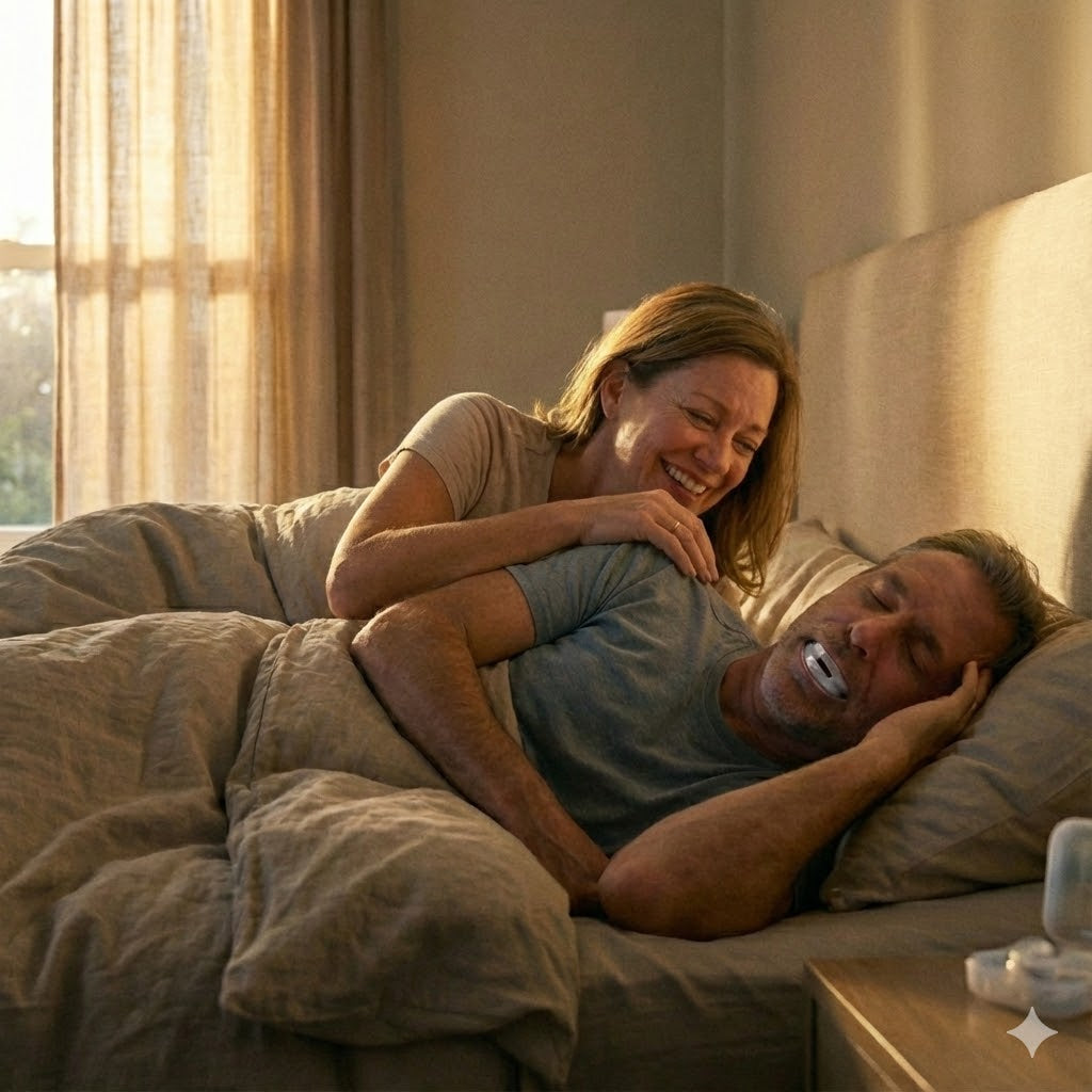 Most people need 3-5 nights to fully adjust. The first couple of nights might feel strange—your jaw isn't used to being held in position. Some people experience mild jaw ache, similar to wearing a retainer for the first time. But here's what we hear over and over: "By night five, I didn't even notice it." The AirRest moulds to YOUR teeth specifically, so it's not a generic one-size-fits-all piece of plastic. That custom fit makes all the difference. Most partners report their snorer keeps it in all night from the first week onwards.